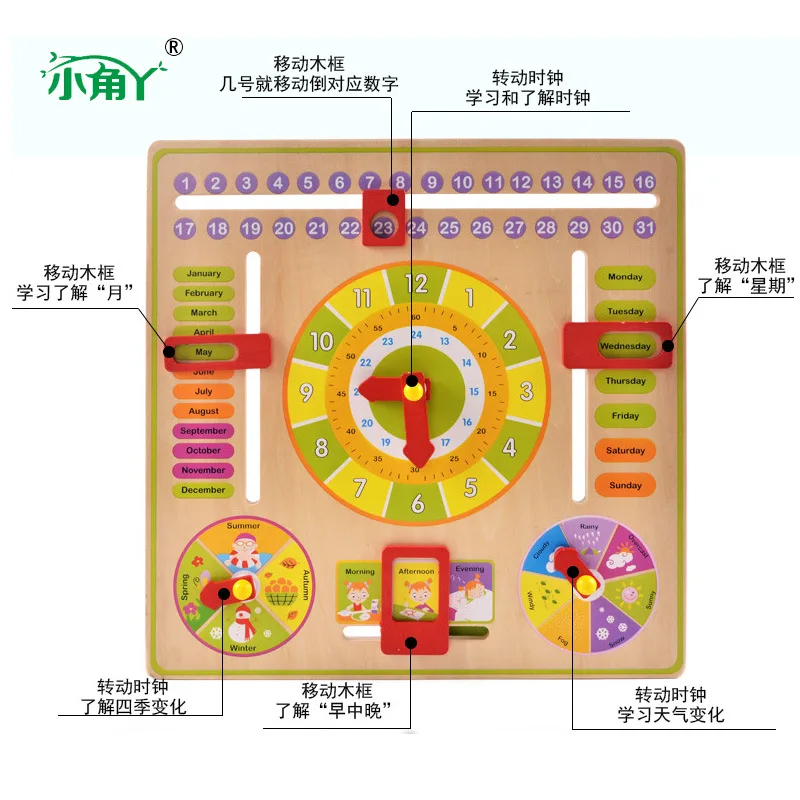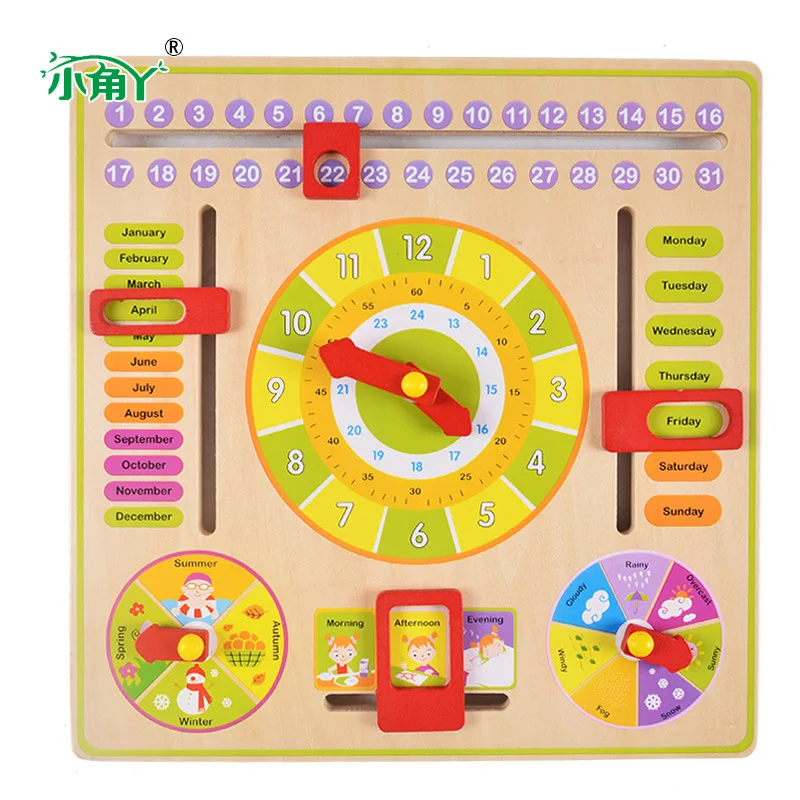 Wooden Multi-functional with Numbers Clock Calendar Season Weather Alarm Clock Cognitive Learning E